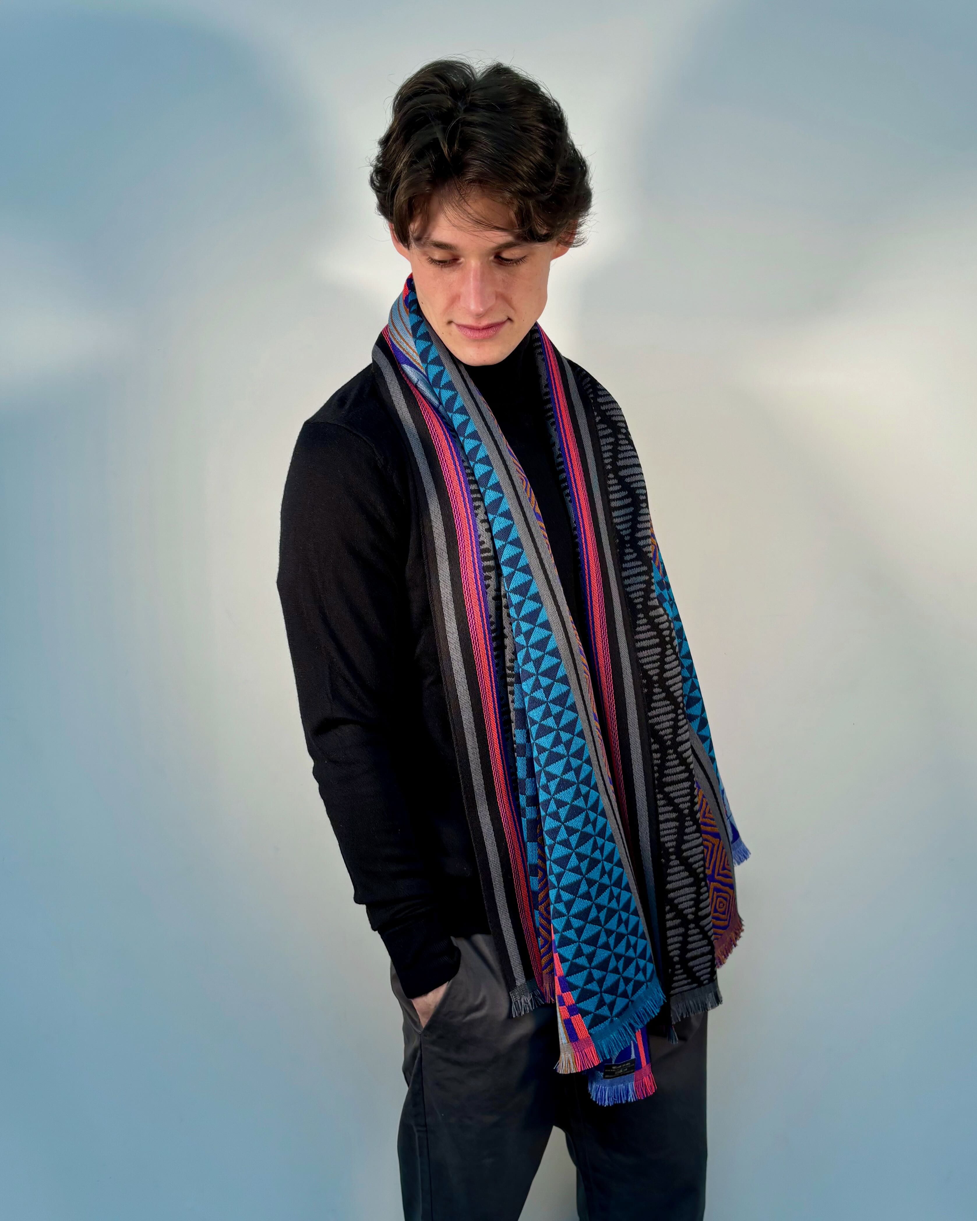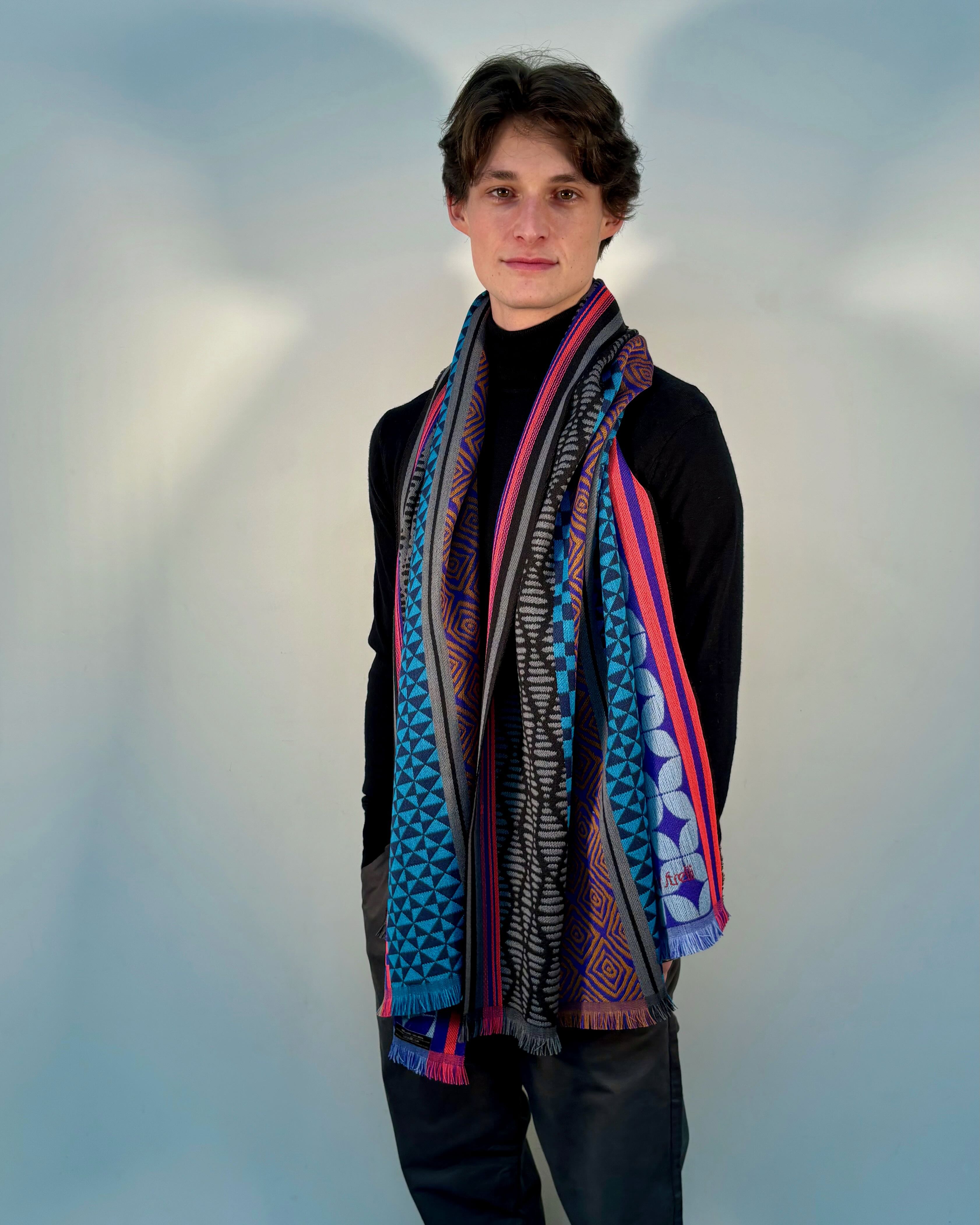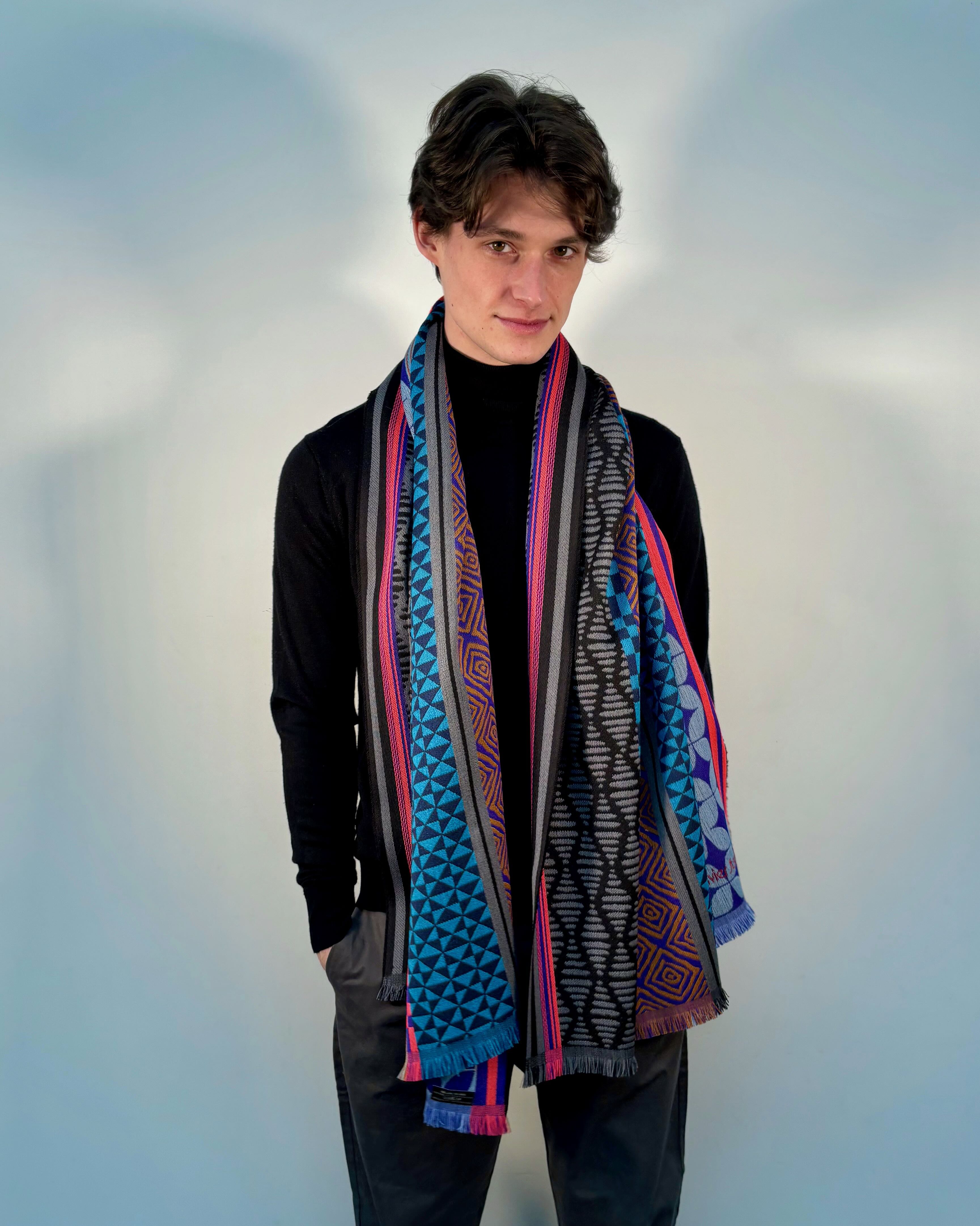Unisex scarf woven 100% wool, colorful Geometric Vintage design